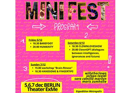 MINI FEST ist eine kleine, intensive Reise in das Universum des zeitgenössischen Clownings, in dem Körpersprache, visuelle Ausdrucksformen und Vorstellungskraft zusammenkommen, um Geschichten zu erzählen – ganz ohne Worte. Auf der Bühne wechseln sich Clowns ab: mit ihren Füßen, mit ihren Händen, durch Objekt- und Bewegungstheater – jede Vorstellung trägt ihre eigene Sensibilität und poetische Verrücktheit in sich. Aufführungen für alle Altersgruppen, die körperliches Theater, visuelle Komik und die zarte Akrobatik des Alltags verbinden – um uns zum Lachen, Staunen und manchmal sogar zum Nachdenken zu bringen.